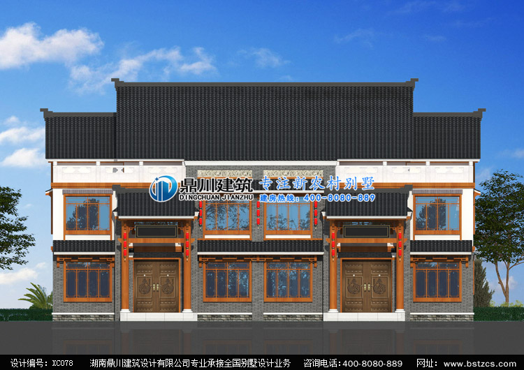 XC078农村二层半双拼中式别墅设计图效果图,鼎川建筑中式双拼别墅定制设计