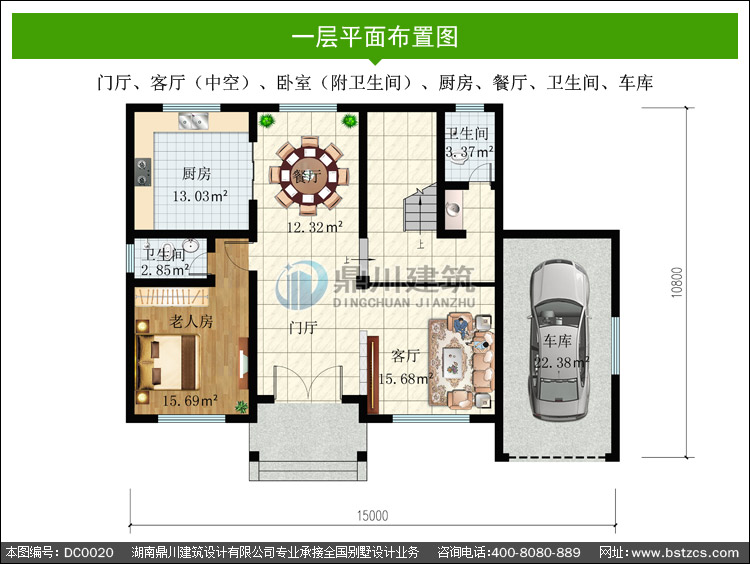 | 一 层: | 门厅、客厅(中空)、卧室(附卫生间)、厨房、餐厅、卫生间、车库 | |||