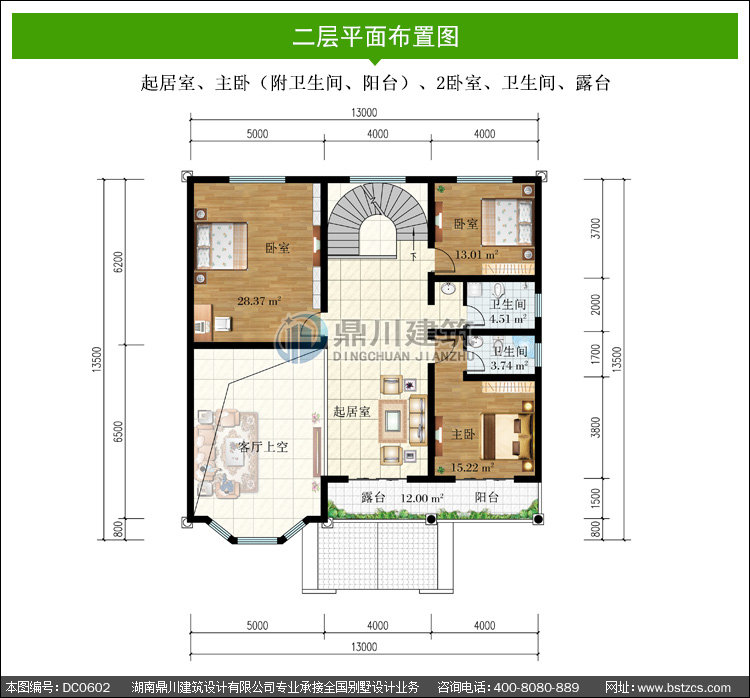 | 二 层: | 起居室、主卧(附卫生间、阳台)、2卧室、卫生间、露台 | |||